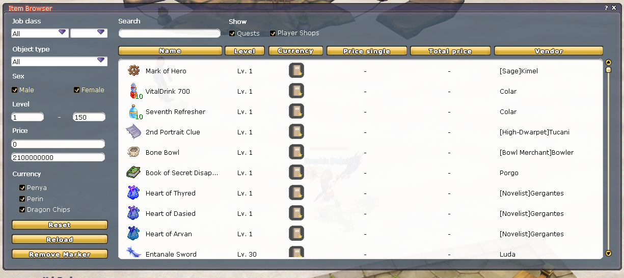 The Item Finder is a system that lists all quest rewards and player/offline vendor shops.